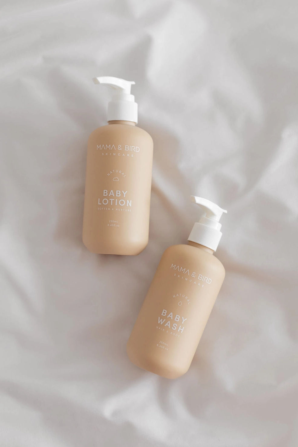 A gentle daily use duo created to lovingly care for your little ones skin. Baby Wash -Create a calming bath time experience with our gentle daily use hair and body wash. Nurturing natural oils and extracts work together to tenderly clean and condition the skin. Our soap-free wash deeply hydrates, without stripping the skin of its natural moisture and oils. Baby Lotion - Nourish and protect your little ones sensitive skin with our beautiful daily use baby lotion. Created with natural, botanical ingredients ideally suited to babies and children, the light and creamy lotion leaves bubs feeling soft and smooth. Certified Vegan & Cruelty Free.