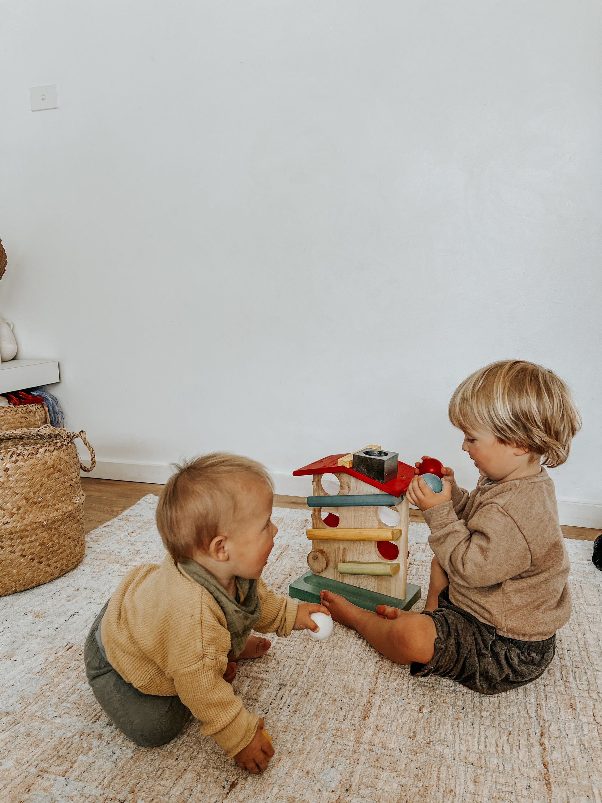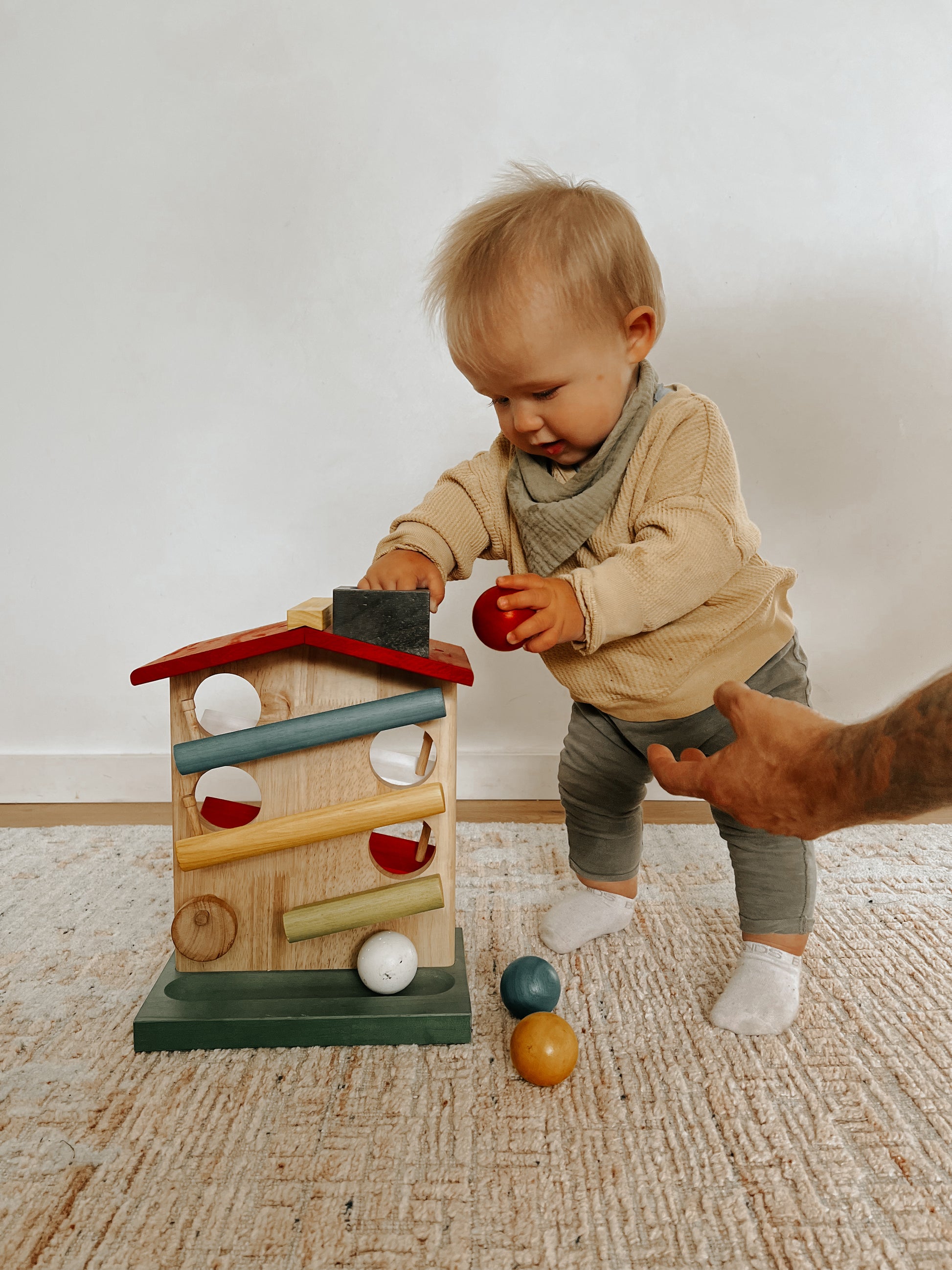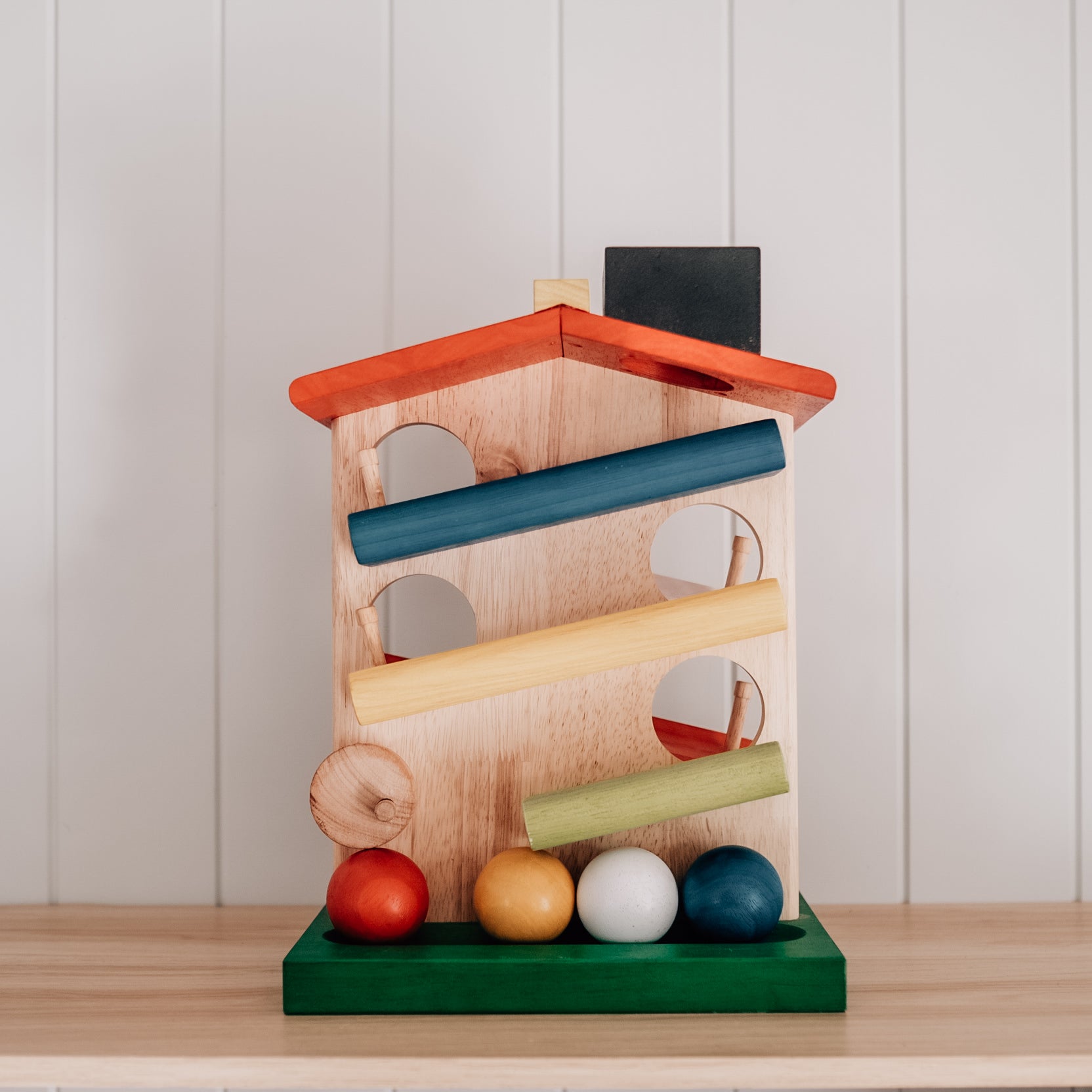 This toy includes a sturdy house with four chunky balls. Children will love watching the balls roll through the house! This is also a great eye tracking toy for toddlers. The item is made from child-safe and non-toxic materials.