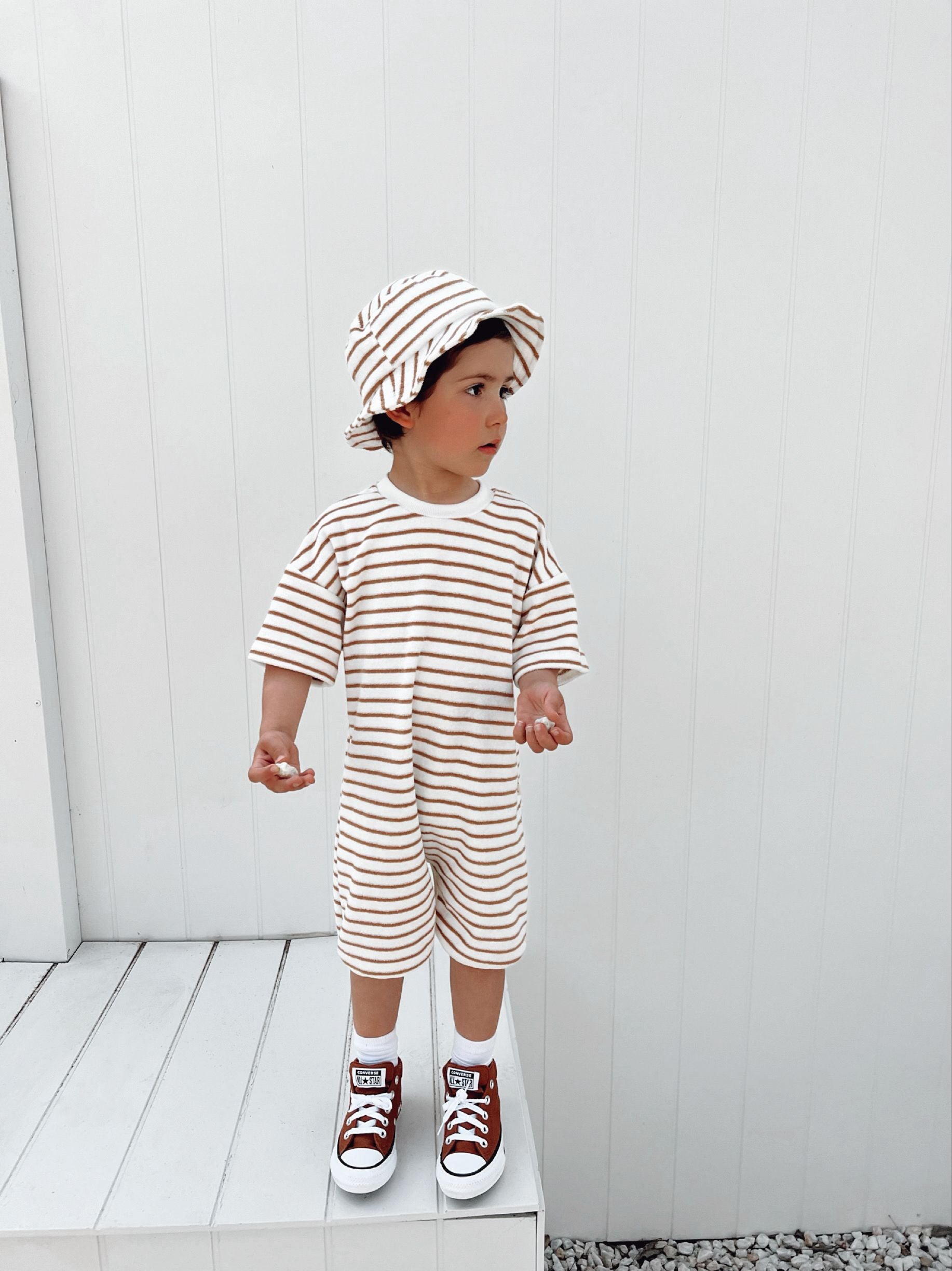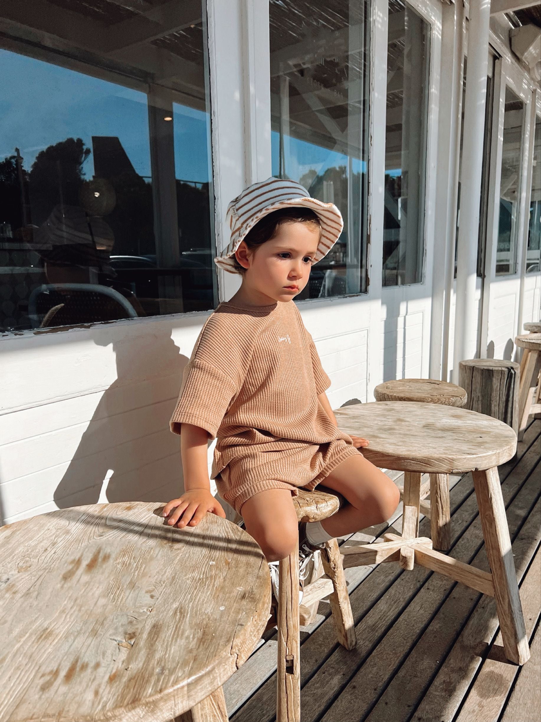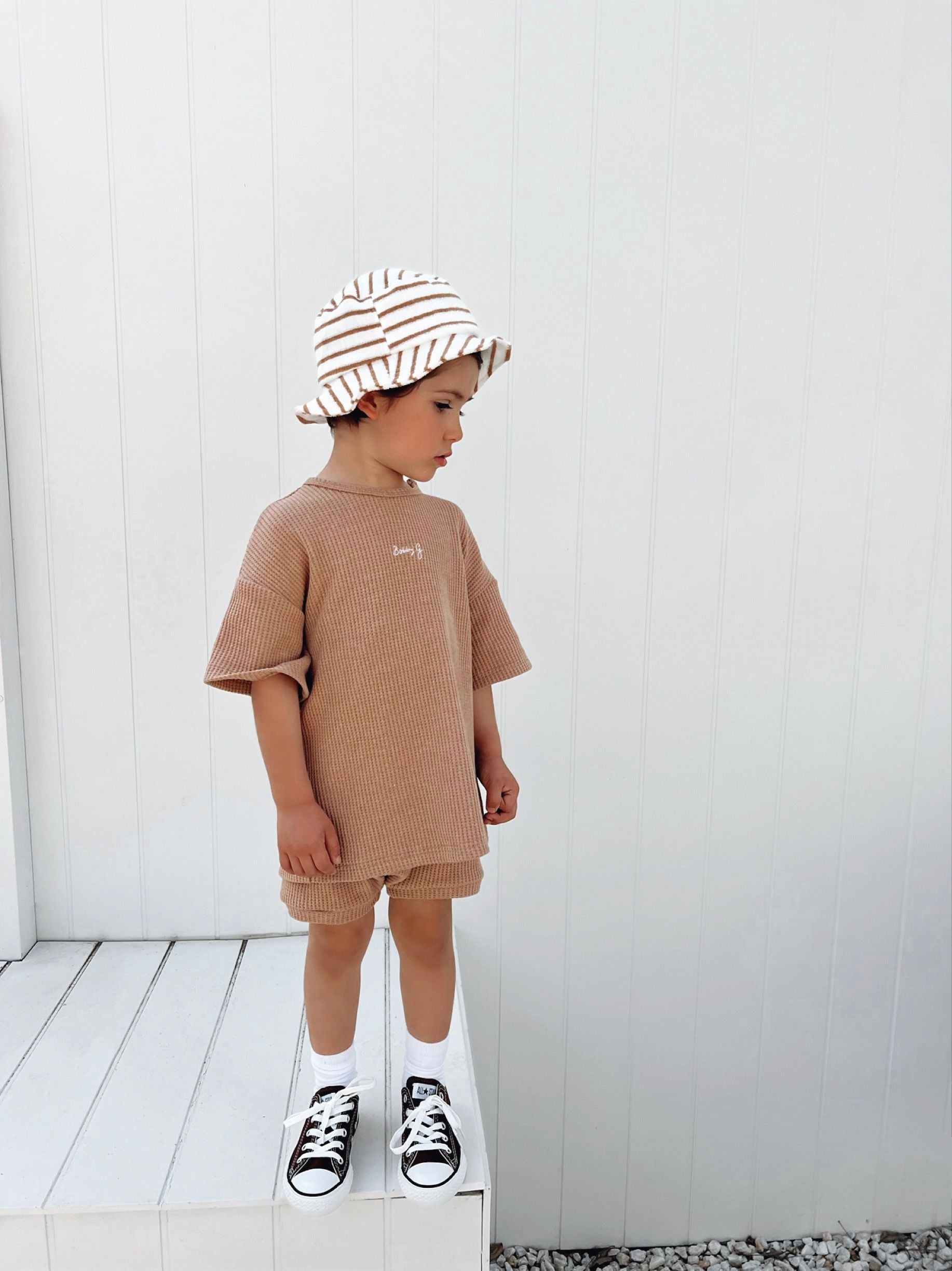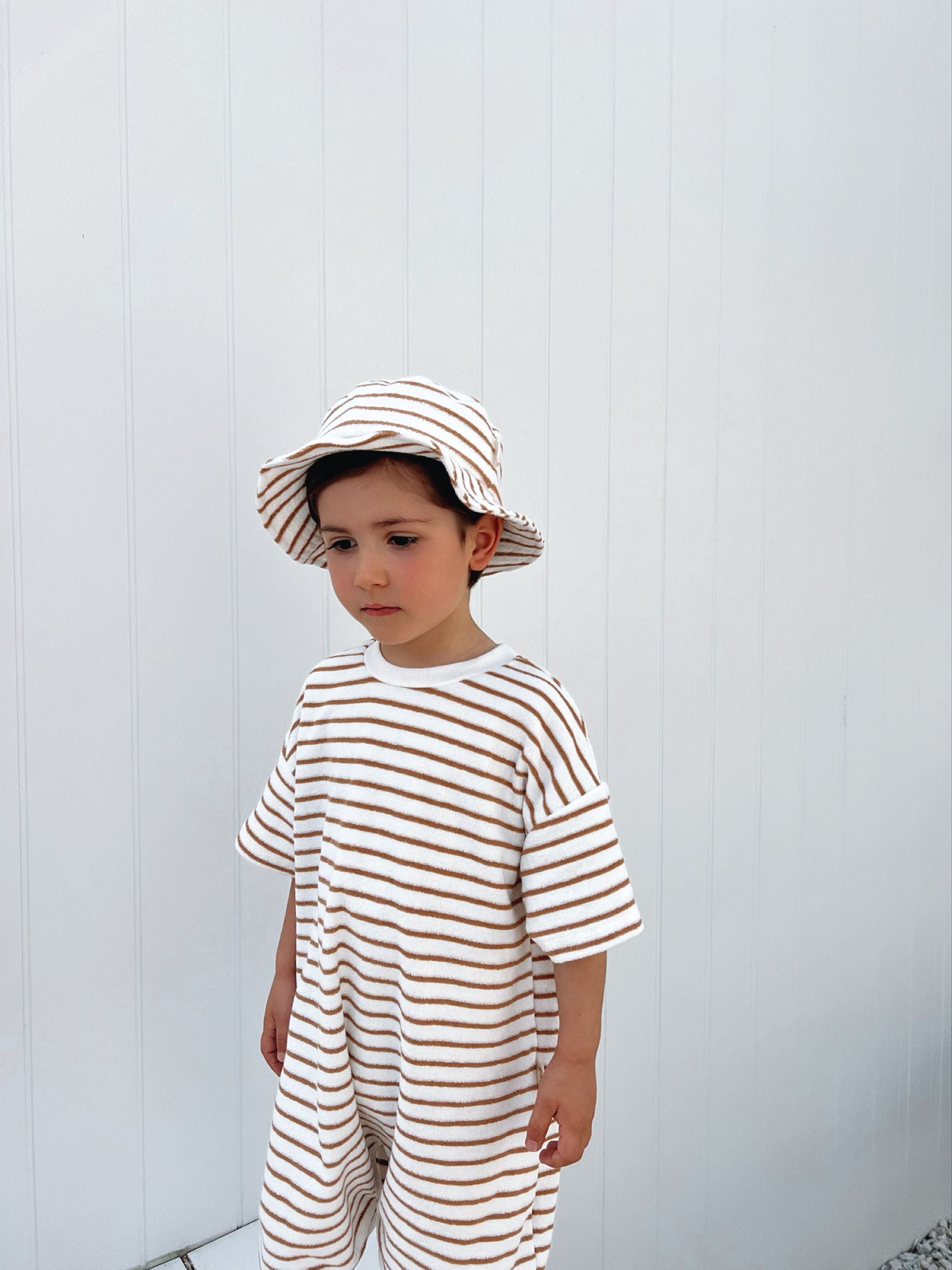 Introducing our Kids Bucket Hat - a stylish and practical accessory designed to protect your child from the sun. With its wide brim, it shields their face, neck, and ears from harmful UV rays. Made from durable and lightweight terry towelling, this hat offers comfort and breathability, making it perfect for outdoor
