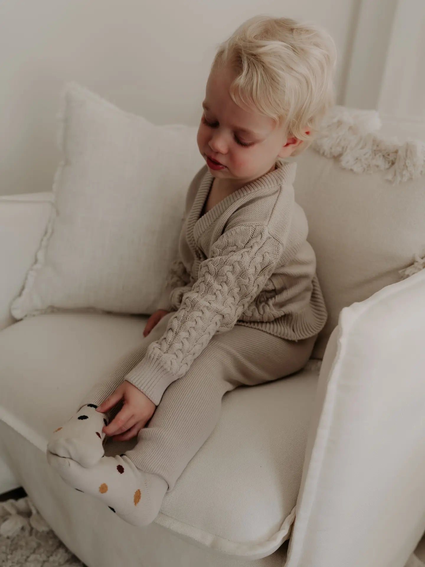This unisex cardigan is a must have coming into the winter months. The attention to detail in this cardigan really makes it a staple piece. It is available in a timeless taupe tone. Our 100% GOTS certified organic cotton yarn, textured cable knit is a winter wardrobe must! * Made with Organic Cotton yarn * True to size * Thick ribbing finishes * Machine washable * Coconut wooden buttons Pair this with our matching taupe knit legging to make the perfect set (sold separately). Composition: 100% Organic Cotton Yarn