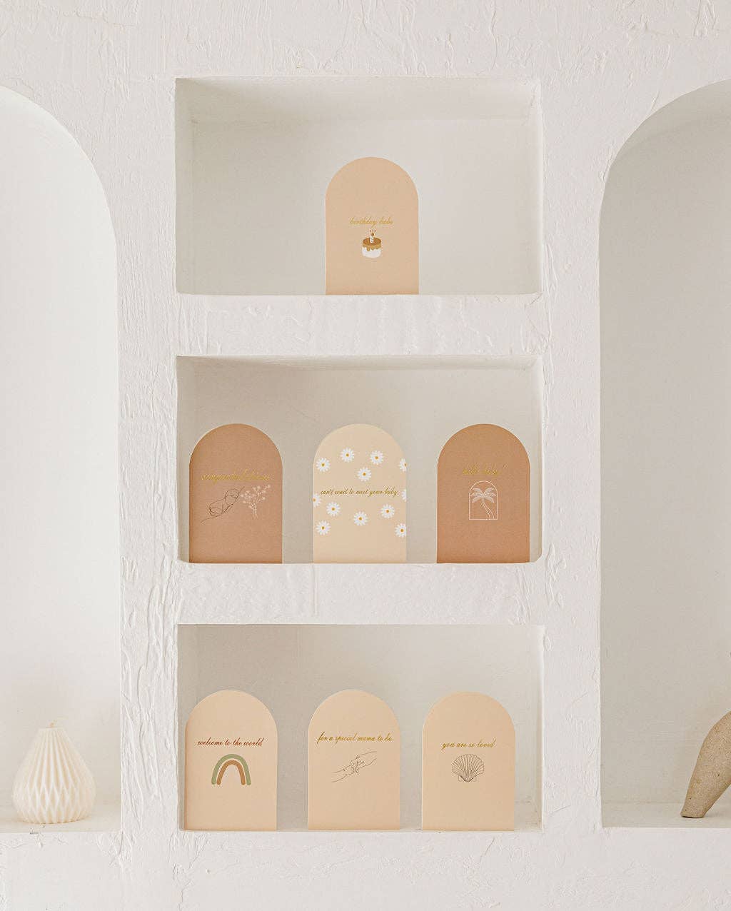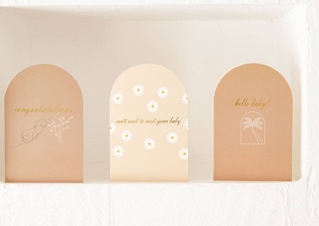 A collection of beautifully designed greeting cards by Woven Kids. These are arch shaped cards with gold foiling and make the perfect finish for a beautiful gift for a loved one.