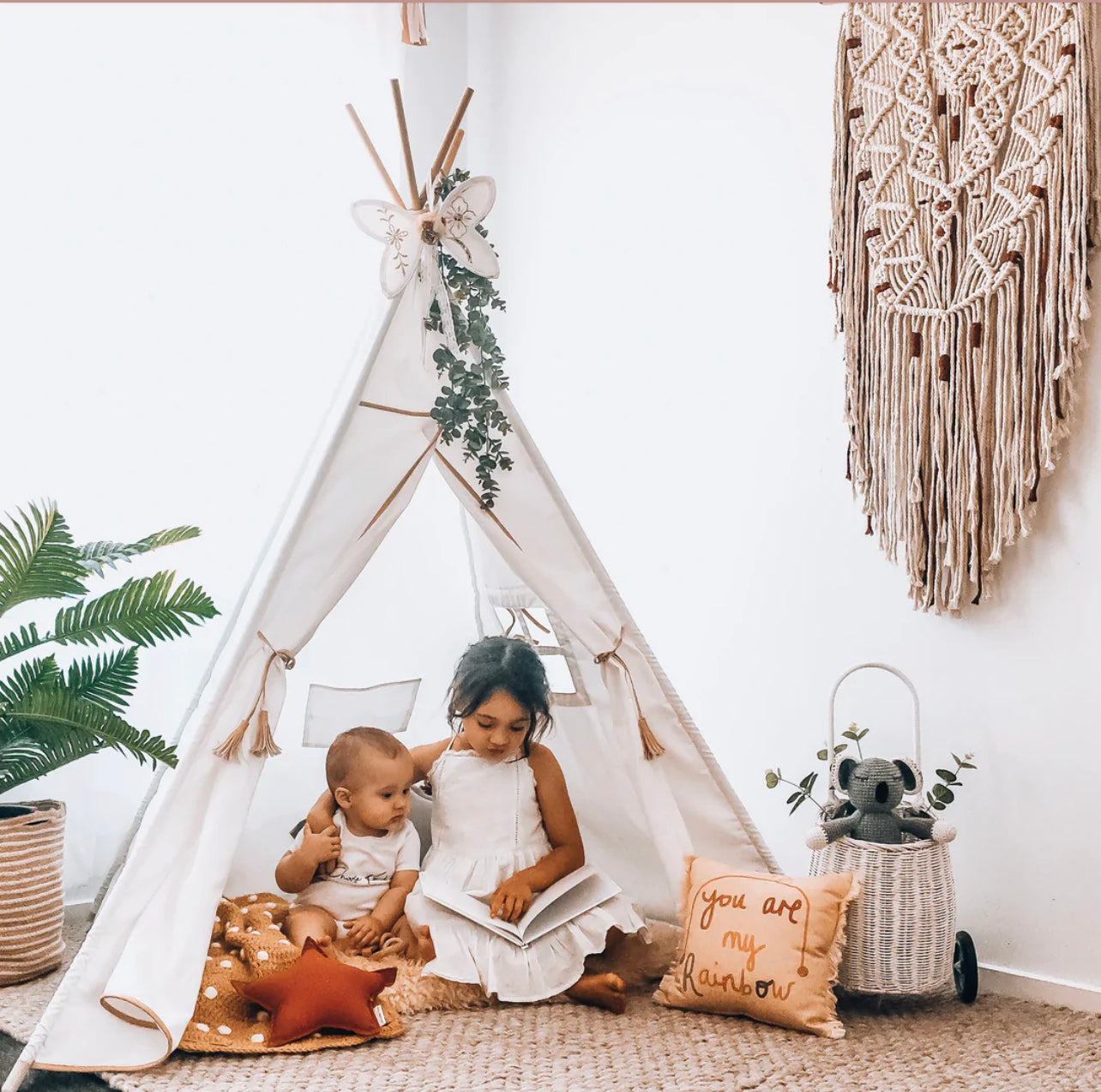 The Cattywampus 'Leatherette' Teepee is made from a crisp white fabric and stunning tan leatherette detailing. It is made from 100% pure cotton canvas, it is soft yet durable, perfect for your little human to play inside. We call this teepee the Golden Star!
