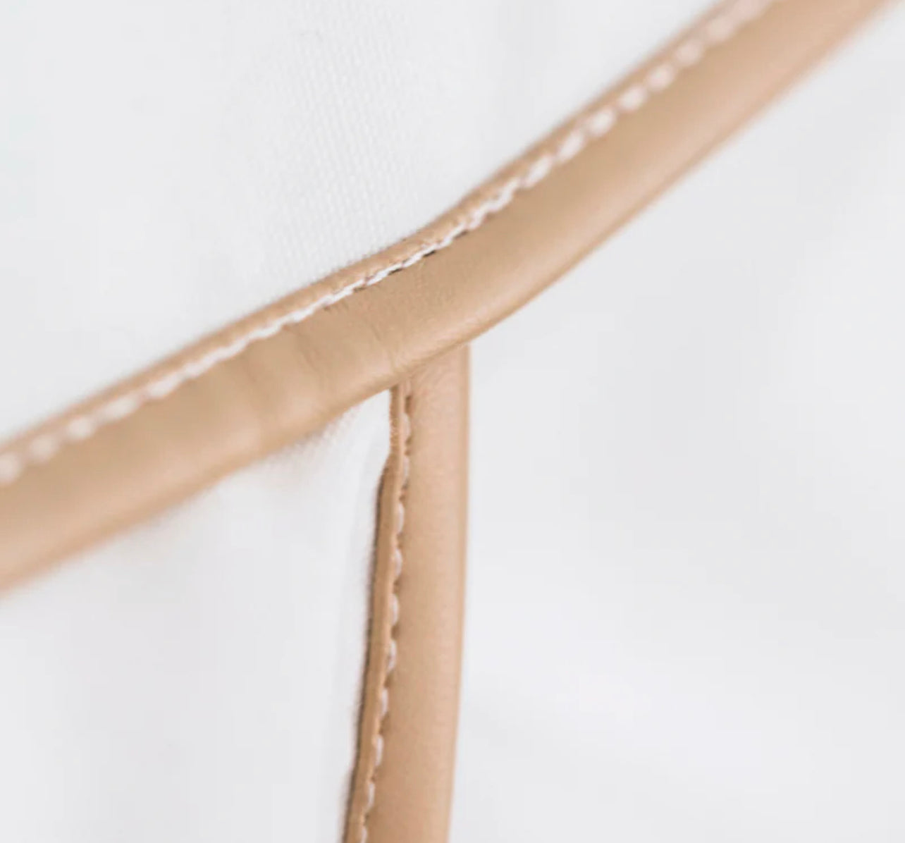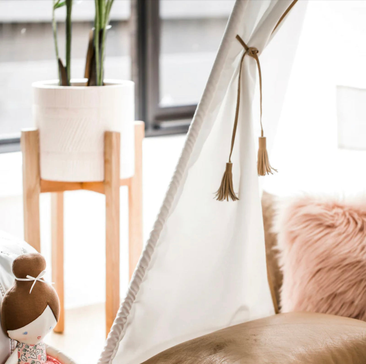 This one of a kind, crisp white teepee has all your favourite teepee features with a luxe leatherette trim for that extra glam. This brand new design like no other is bound to make an impact in your home! It's made with tan leatherette trims with matching tassels perfect for every room in the home. It's the perfect gift for your little human or the stylist in you!