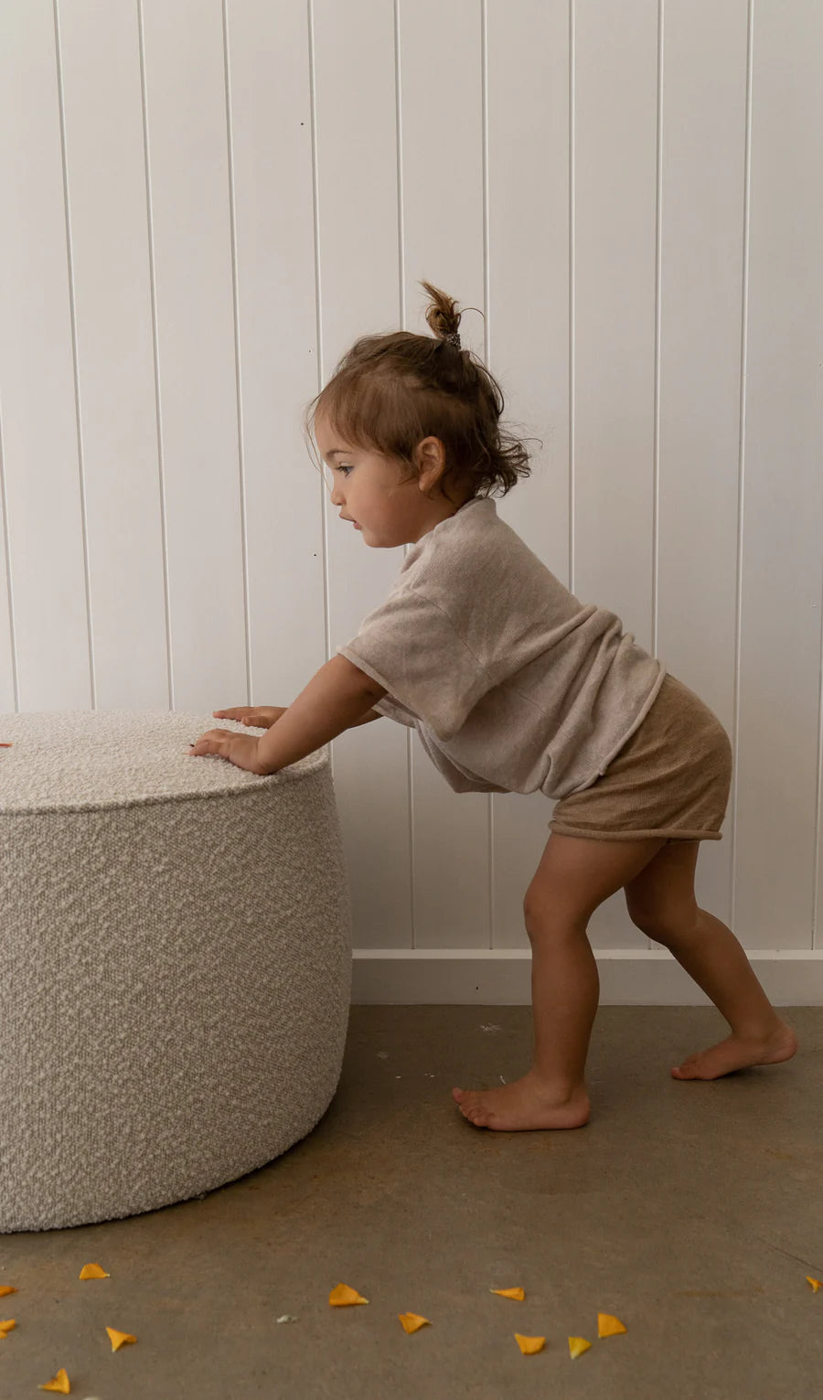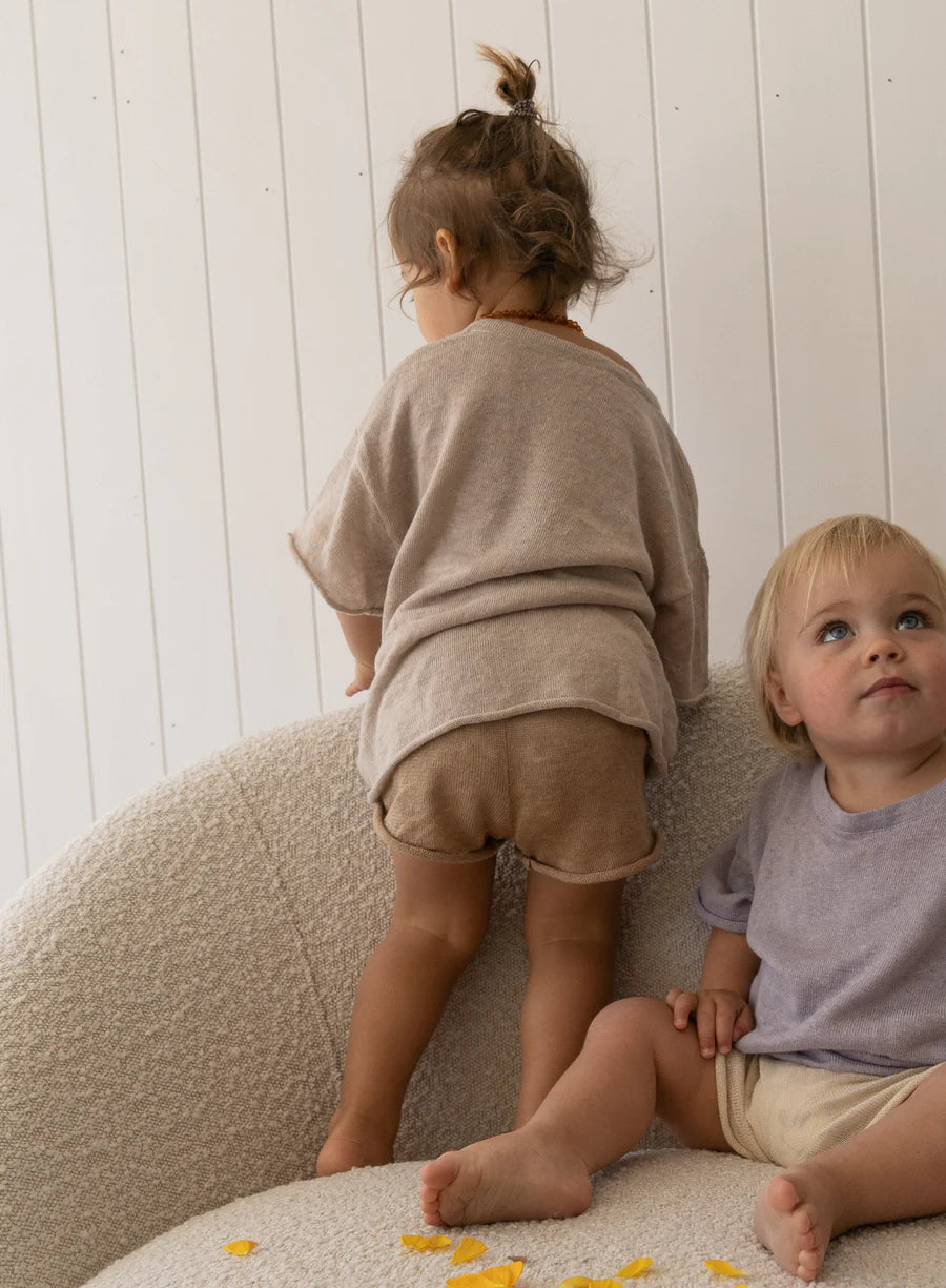 In the images Oli wears size 2-3Y and is just turned 2 years old. The shorts are a high waist design with raw edging and a soft elastic waistband. It is suggested to purchase the shorts within the size bracket your child currently wears. If your child is on the older bracket of age or quite tall, you can upsize in the shorts if you would like more grow room.