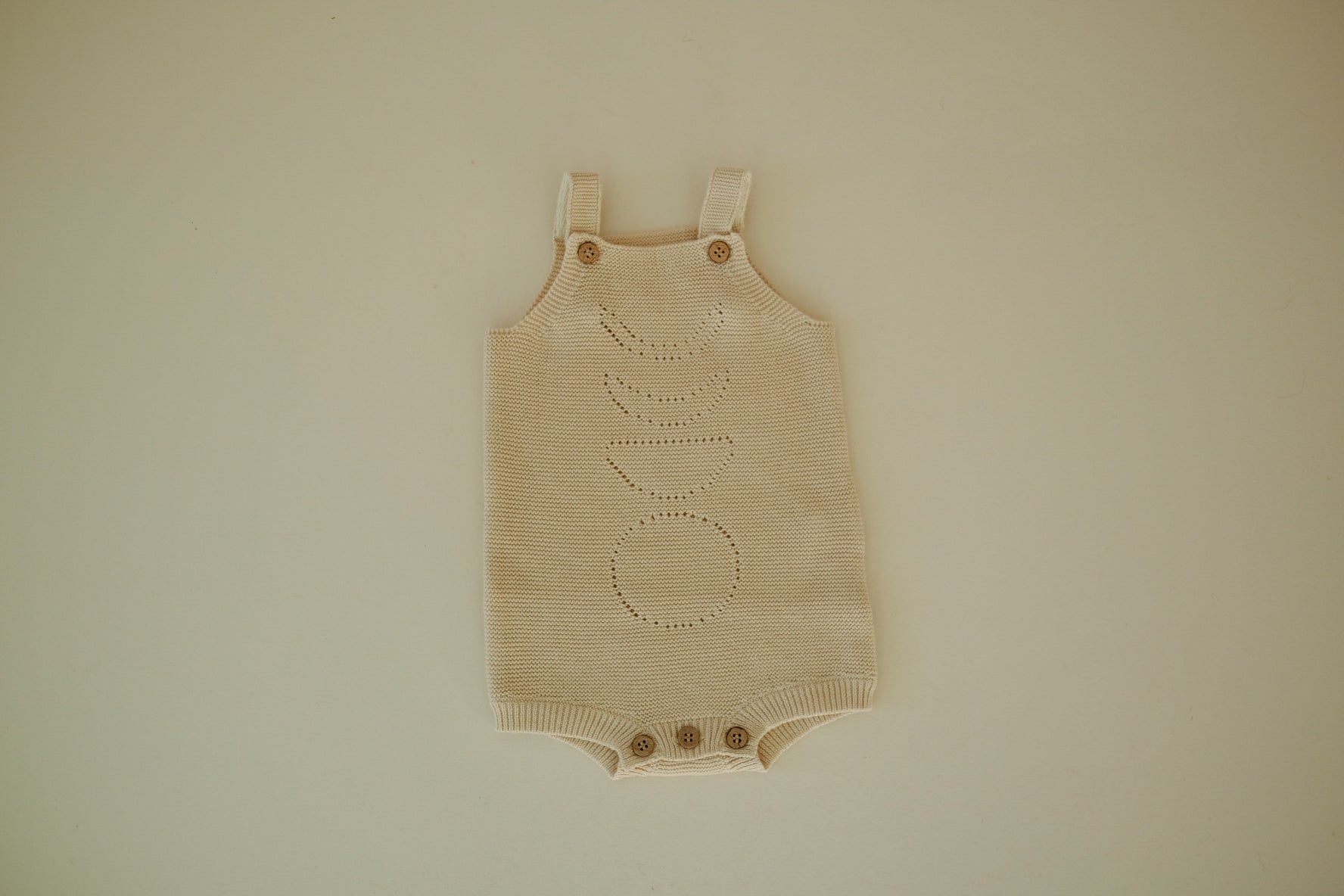 A Pearl knit romper made from 100% Organic Cotton with GOTS certification. This romper features a pearl knit with a pointelle moon phases design on the front and back. This style also has adjustable length straps and coconut shell buttons at crotch and straps.