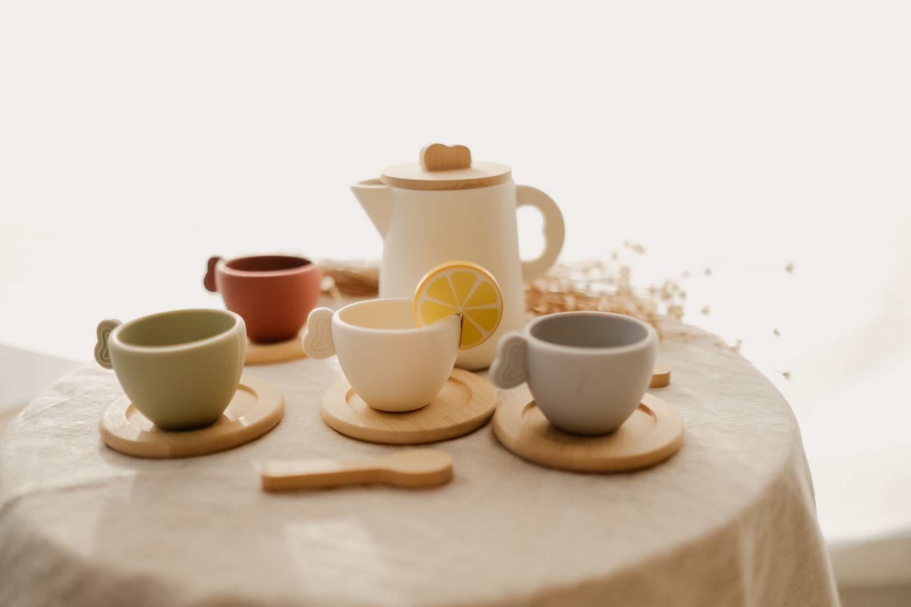 Spark your child’s imagination with our adorable silicone and wood tea set, perfect for cozy pretend tea parties! This beautifully crafted set includes a selection of colorful cups, wooden coasters, and a teapot with a charming wooden lid. Each set also comes in a dust-proof canvas bag, making it easy to store and carry for on-the-go playdates. Recommended for ages three and up, this set is designed with safety in mind but contains small parts, so it's ideal for kids ready for a bit more grown-up play. Let the tea party fun begin with this delightful, nature-inspired tea set!