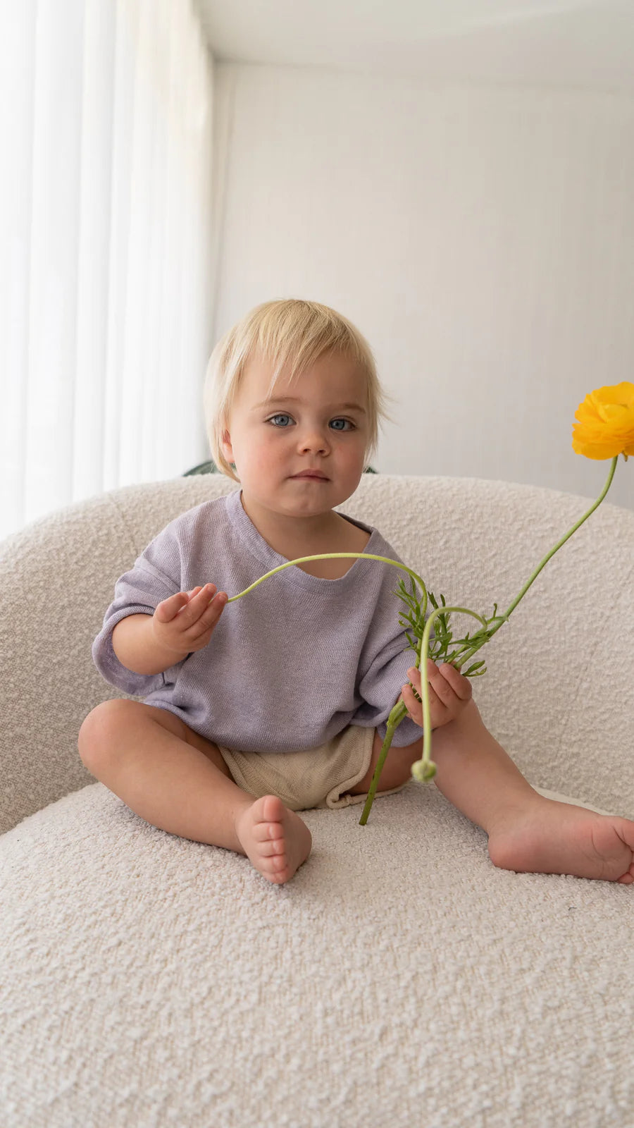 Remi in images wears a size 2-3Y and is 18 months old. The fit and design is oversized/relaxed, we suggest that you shouldn't need to size up to achieve the oversized look. The linen oversized tee is designed with a scoop neck and raw edging.