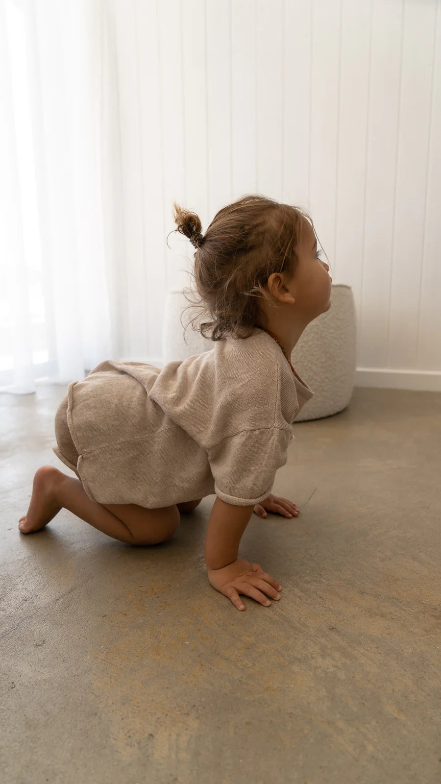 Oli in images wears a size 2-3Y and has just turned two. The fit and design is oversized/relaxed, we suggest that you shouldn't need to size up to achieve the oversized look. The linen oversized tee is designed with a scoop neck and raw edging.