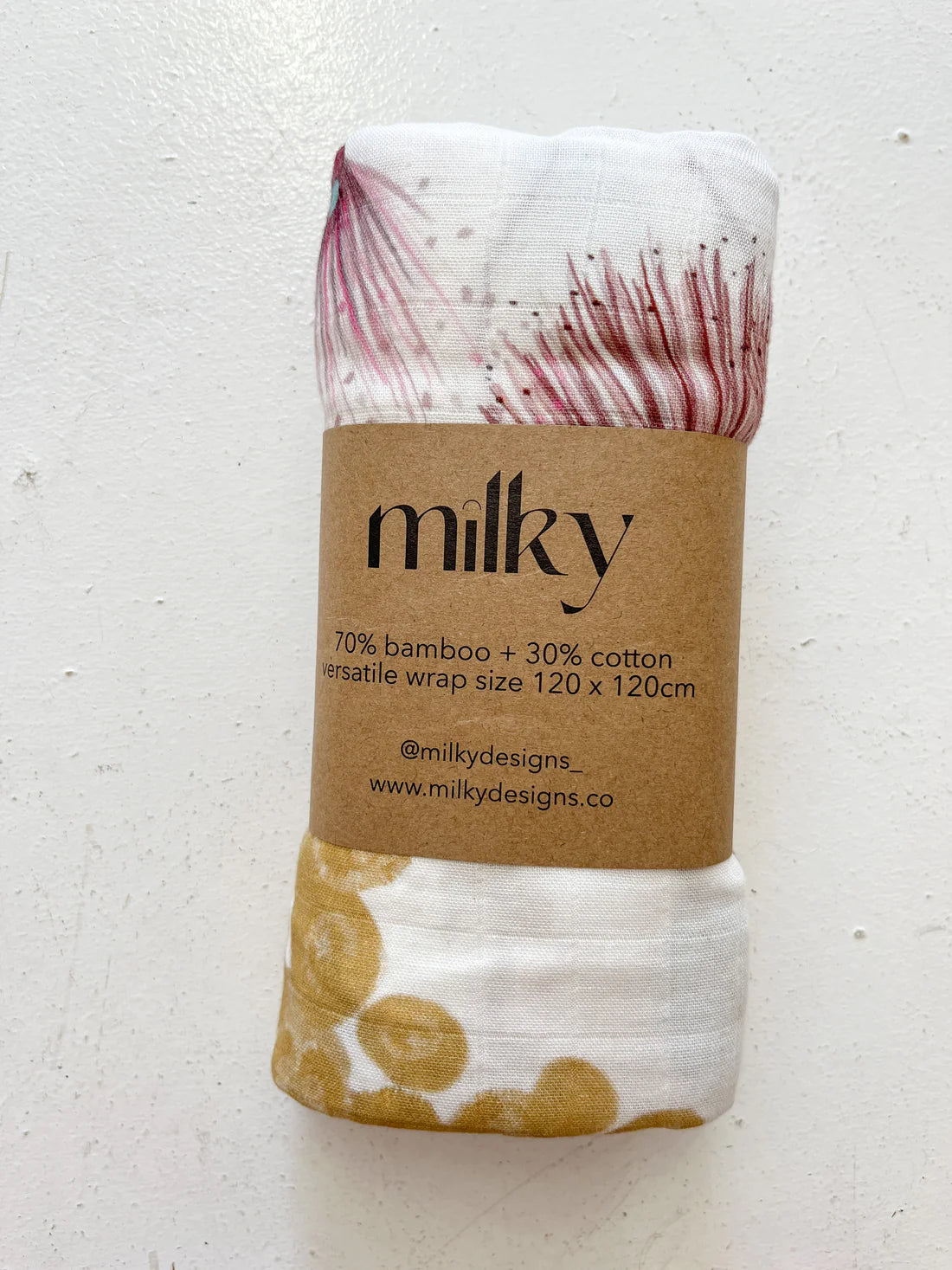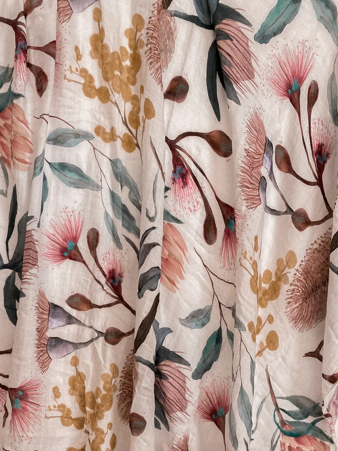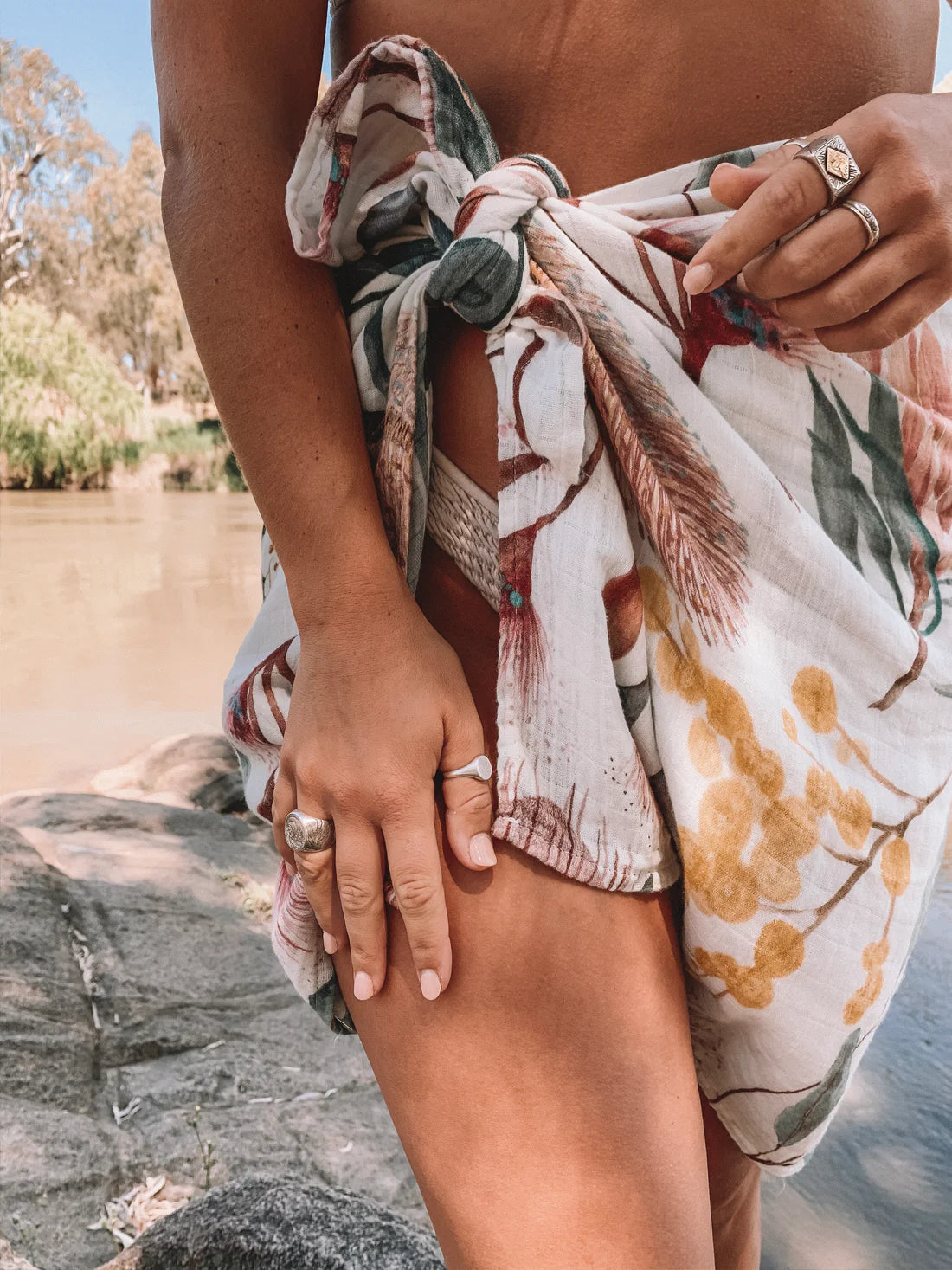 With versatility in mind, they can be used for swaddling, nursing, a lightweight blanket, pram covers and bassinet sheets and for our Mama’s they’re used as throws, outdoor towels and our favourite way, a sarong for the warm summer months.