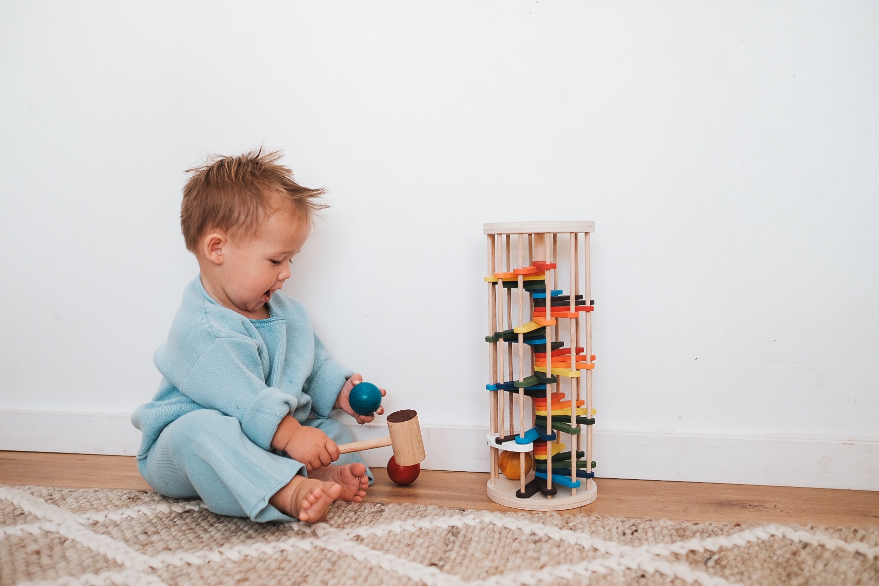 Pound the balls from the top and enjoy watching the colorful balls rolling through the rainbow track! This is a great toy for eye tracking and motor skills.