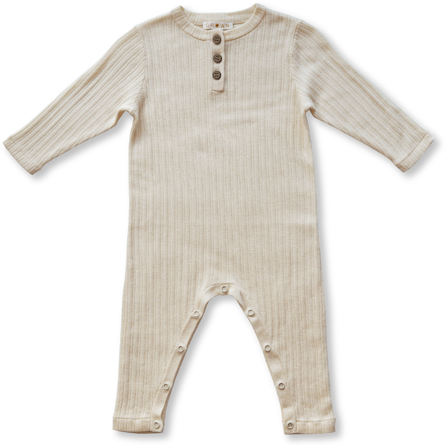 Knitted ribbed bodysuit made from GOTS certified organic cotton. This bodysuit has long sleeves, press snaps at the crotch and coconut shell buttons at the centre front placket. This bodysuit has a relaxed and oversized fit.