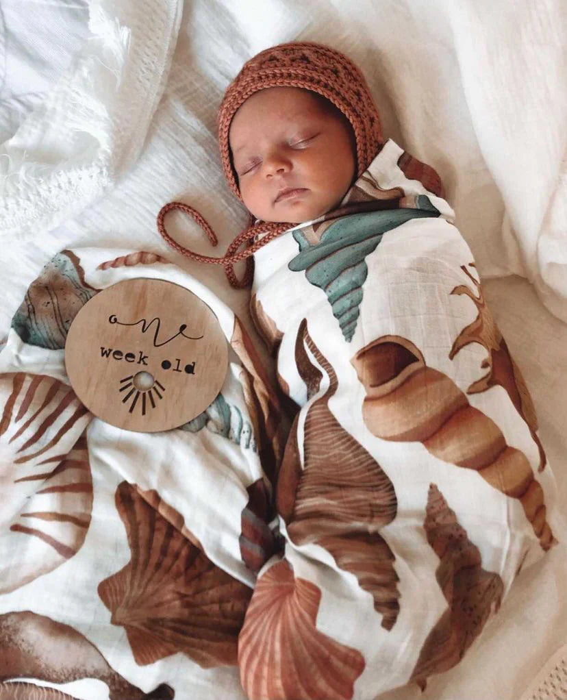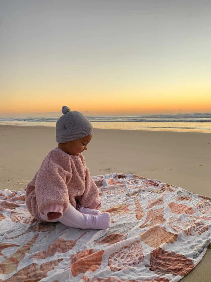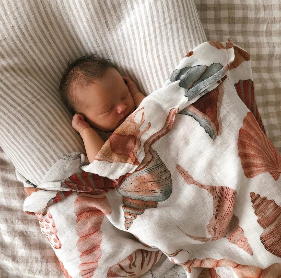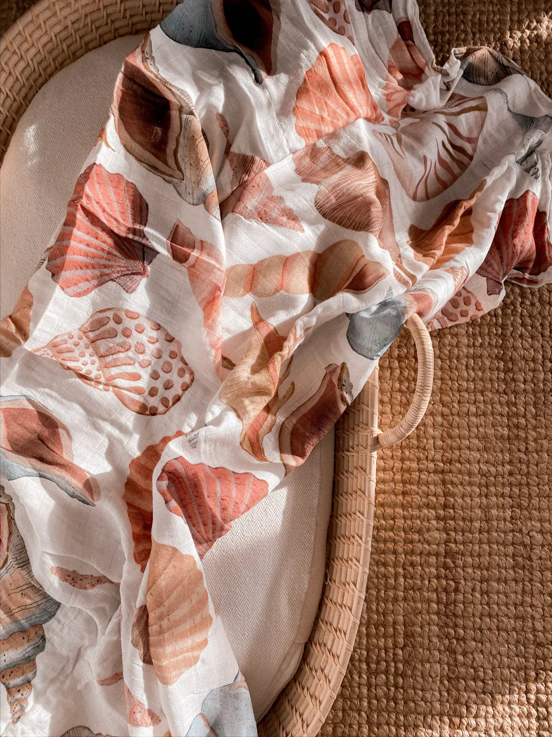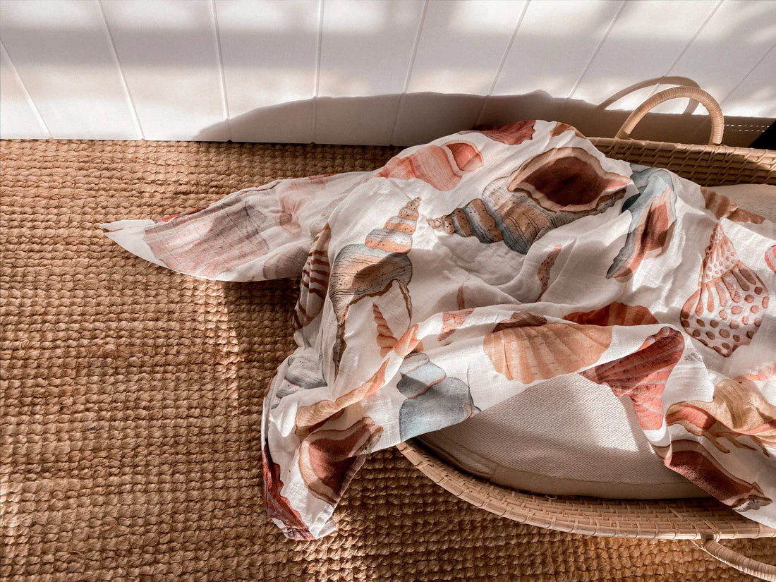 With versatility in mind, they can be used for swaddling, nursing, a lightweight blanket, pram covers and bassinet sheets and for our Mama’s they’re used as throws, outdoor towels and our favourite way, a sarong for the warm summer months.