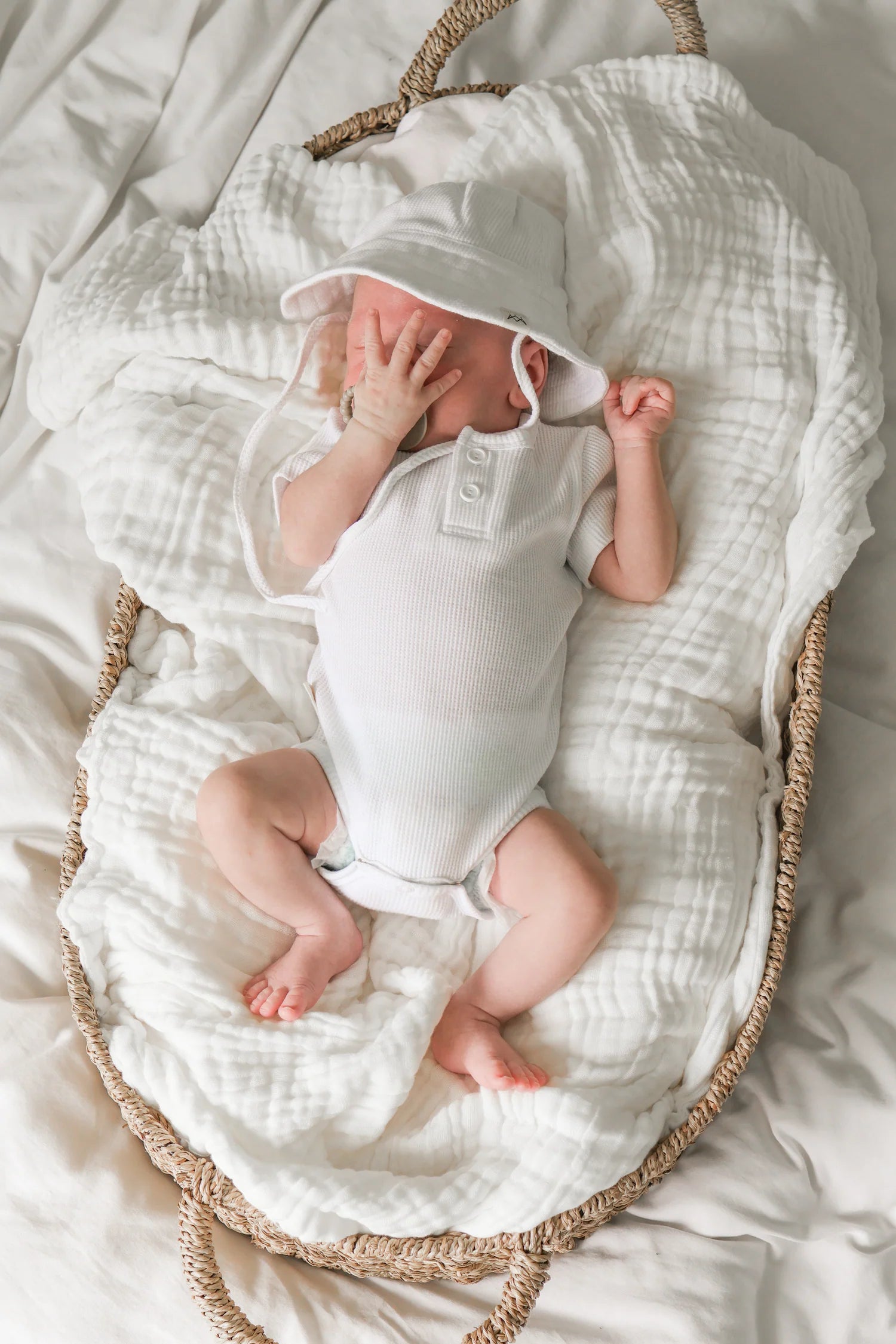 A comfortable and functional summer staple! We are all about the cutest baby basics here and this Bodysuit and matching Sun Hat is perfect for everyday wear! When the afternoon chill sets in simply layer with pants.