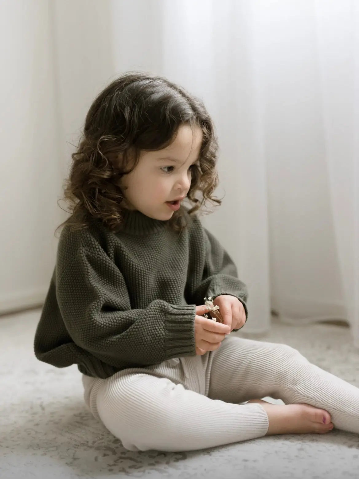 Made from a breathable organic cotton, these knit leggings are easy to mix, match and layer, adding comfort and warmth to your little one's outfit. For a more fitted look, size down. Designed to be paired with our dotty cable knit cardigan. DETAILS: * Tighter fit around the leg * True to size * Stretch waistband is gentle on little tummies * Snug fitting * Lycra insert to ensure leggings don't lose their shape. COMPOSITION: 100% GOTS certified Organic Cotton Yarn !0% lycra insert CARE: • Cool gentle machine wash with like colours using mild detergent • Do not rub, soak or wring • Machine washable • Do not bleach • Line dry in shade