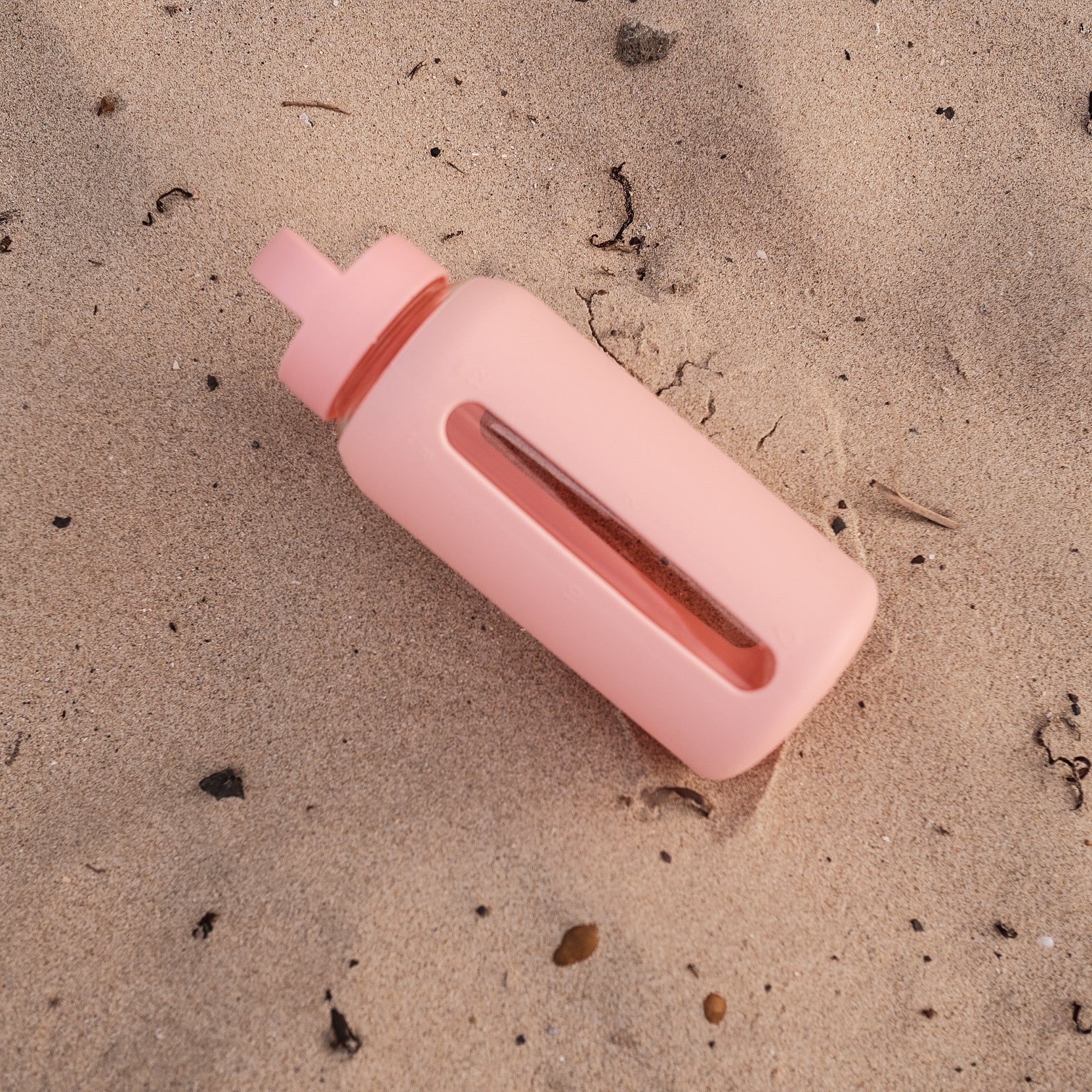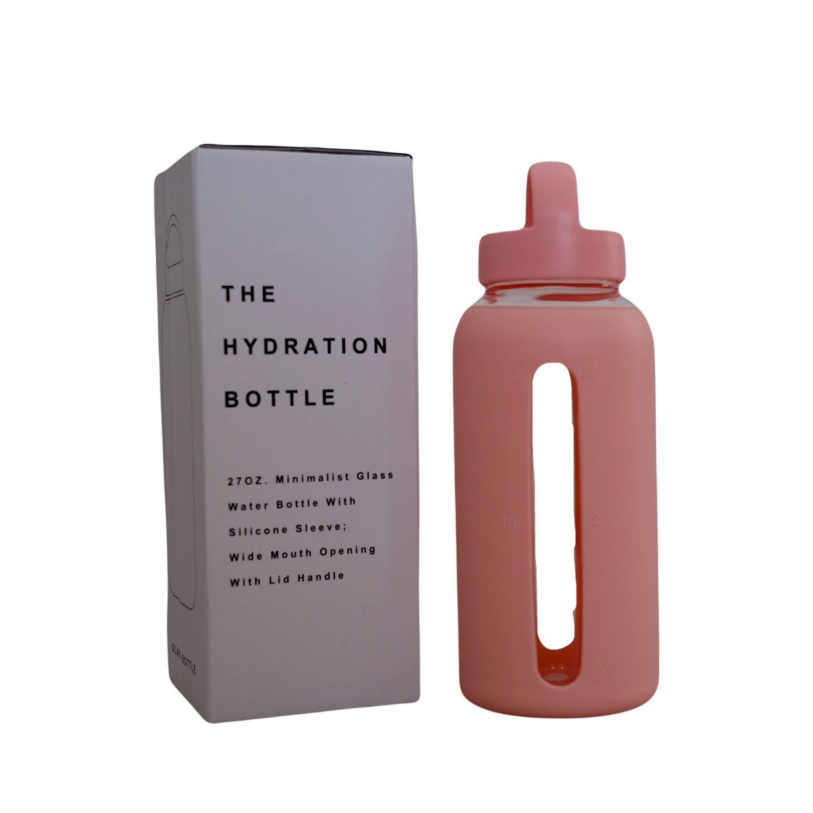 Our Hydration 800ml Day Bottle is a minimalist glass and silicone water bottle with a wide mouth opening and a lid handle