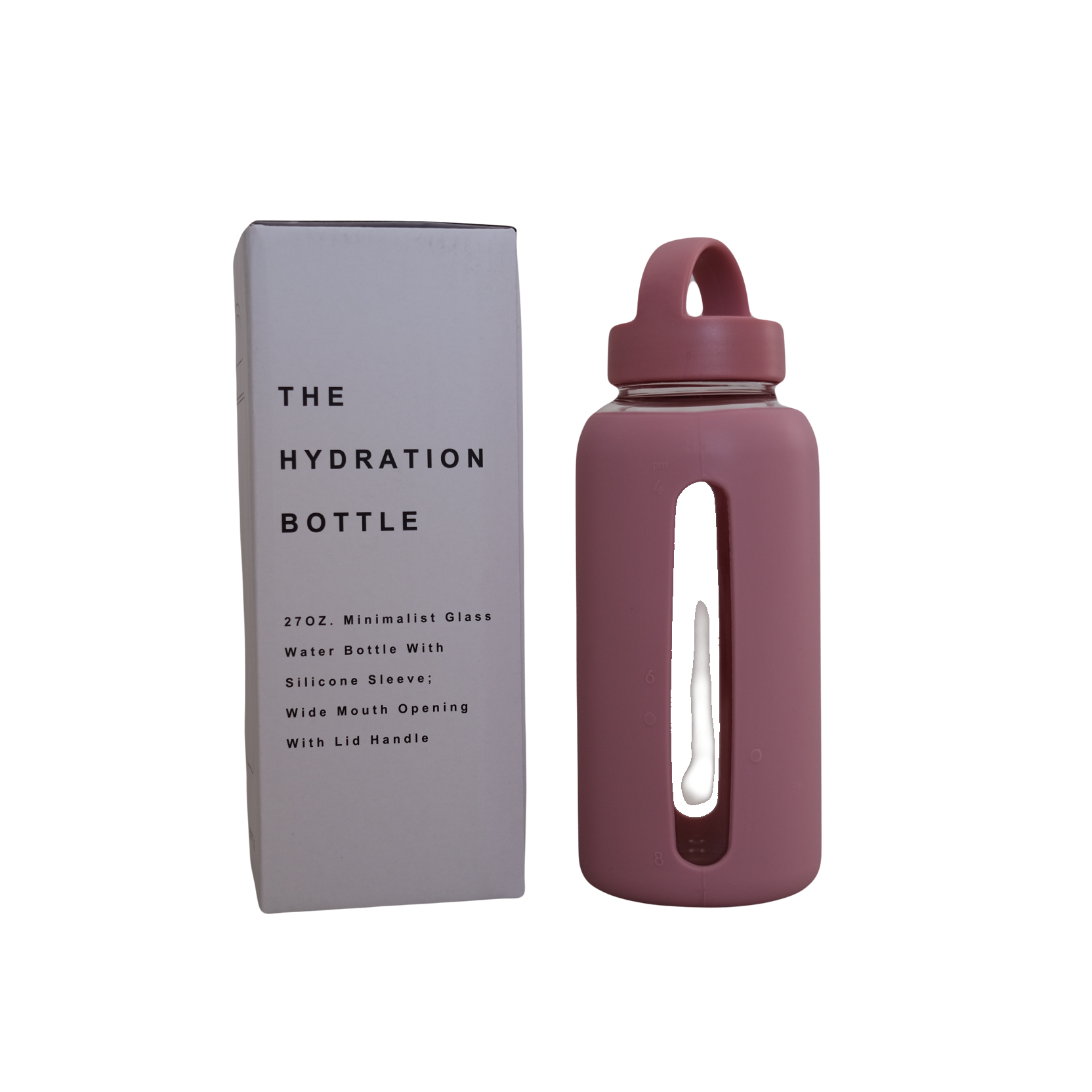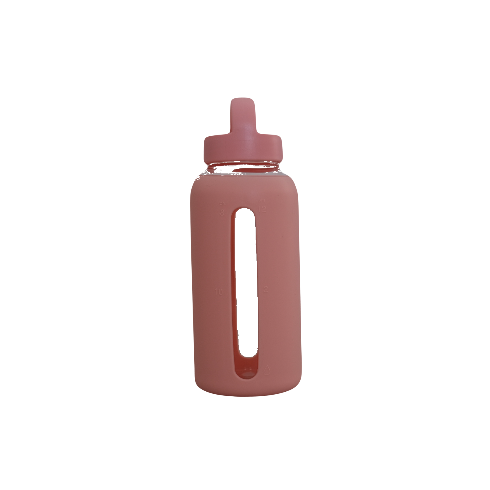 Our Hydration 800ml Day Bottle is a minimalist glass and silicone water bottle with a wide mouth opening and a lid handle